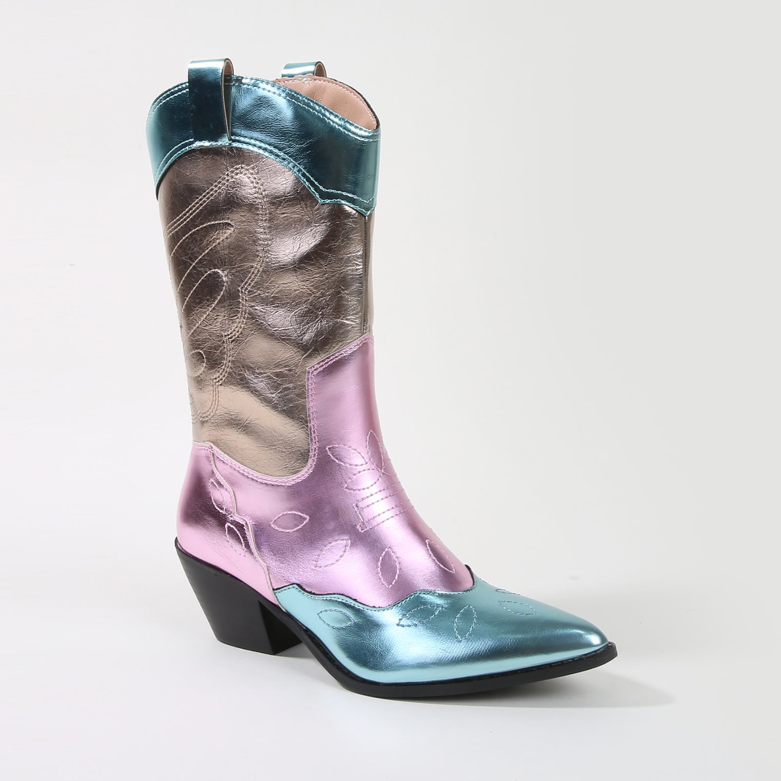 Dare to shine with these metallic cowboy boots, crafted for the bold and adventurous. Featuring a striking mix of metallic hues, these boots elevate the classic Western silhouette with a modern, futuristic twist. Perfect for festivals, concerts, or making a statement in your everyday style, these boots are designed to turn heads wherever you go.