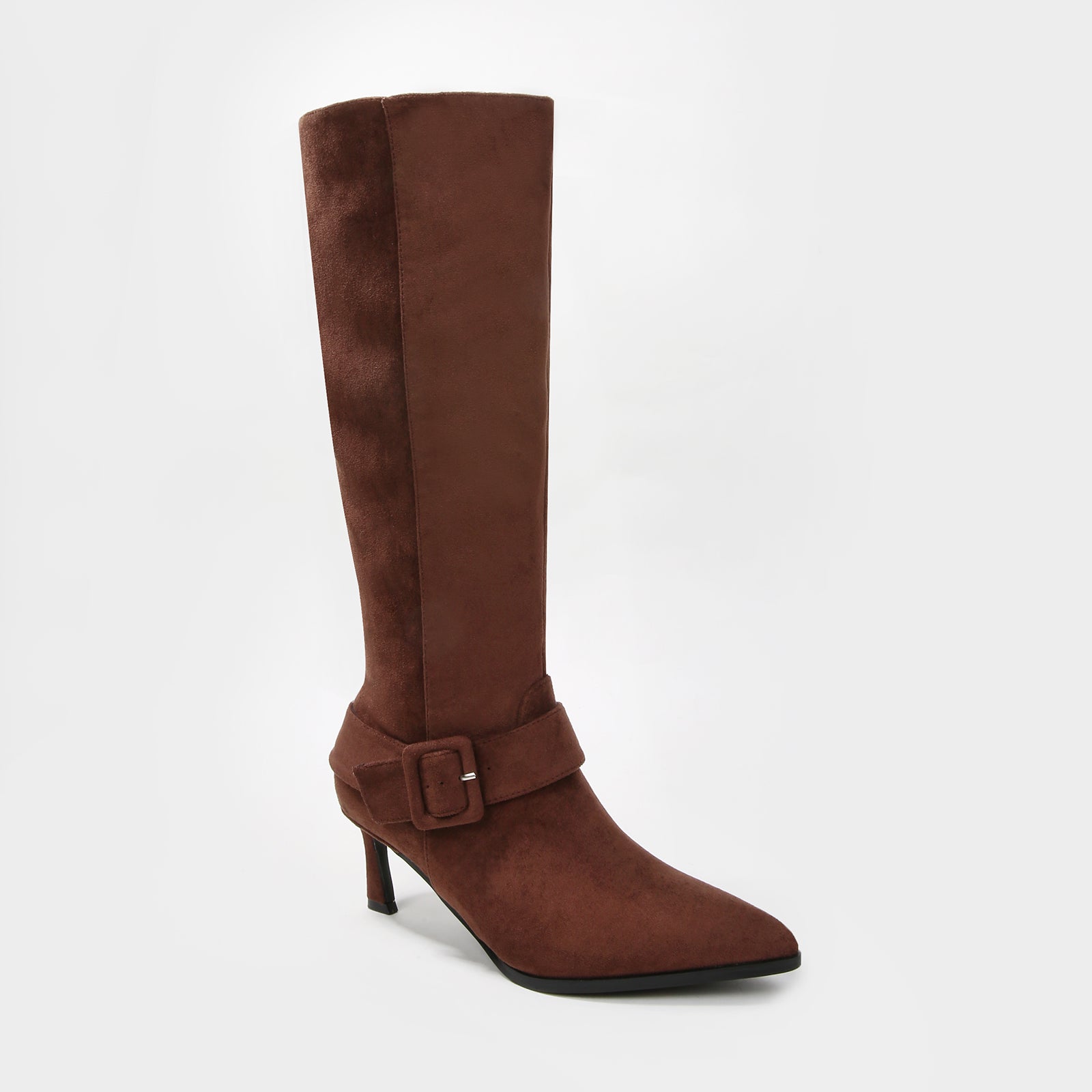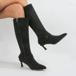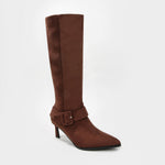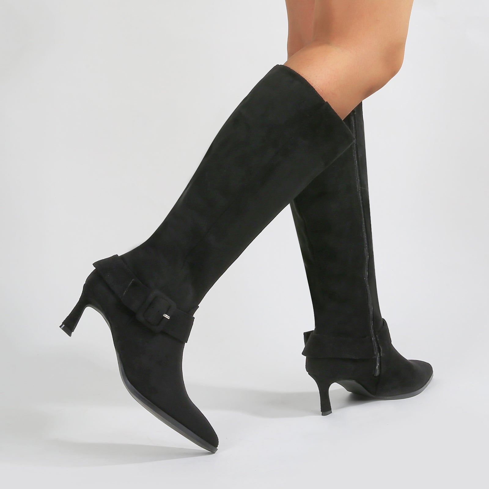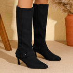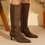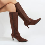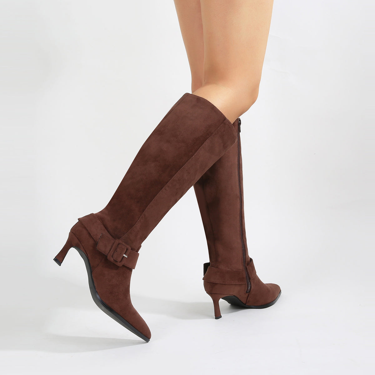 These knee-high suede boots pair a streamlined pointed toe with a slim mid-heel for an effortlessly elegant silhouette. Finished with an oversized buckle strap, they bring a polished, feminine touch to cold-weather dressing. Perfect for work, weekends, or dressy evenings.