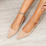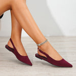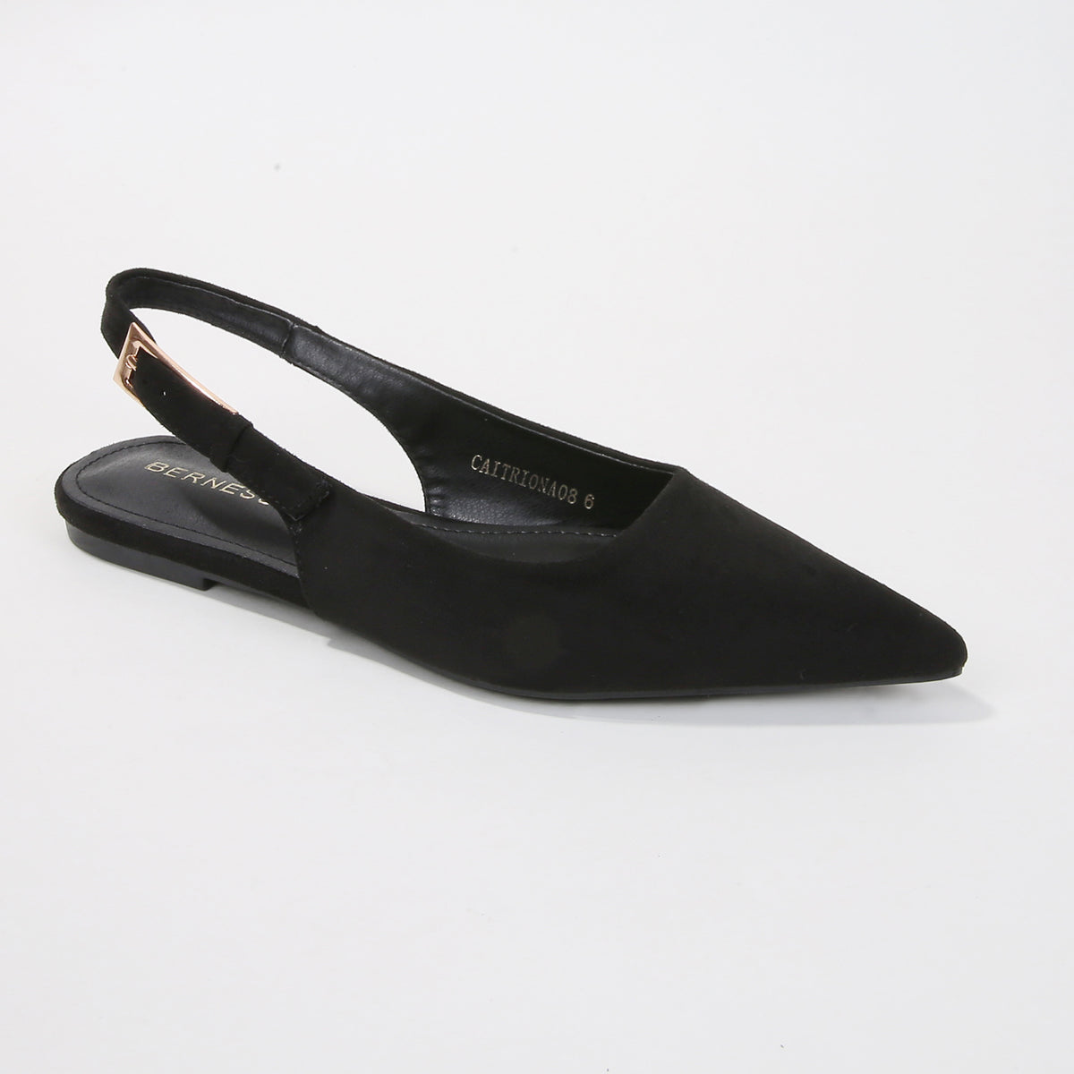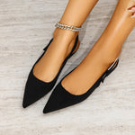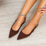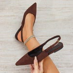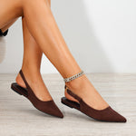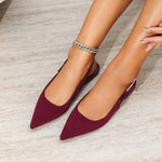 These slingback flats are the definition of understated elegance. Designed with a sharp pointed toe and a low-profile silhouette, they feature a soft suede finish and an adjustable strap with a sleek metallic buckle. A chic essential that complements both workday tailoring and weekend casuals.