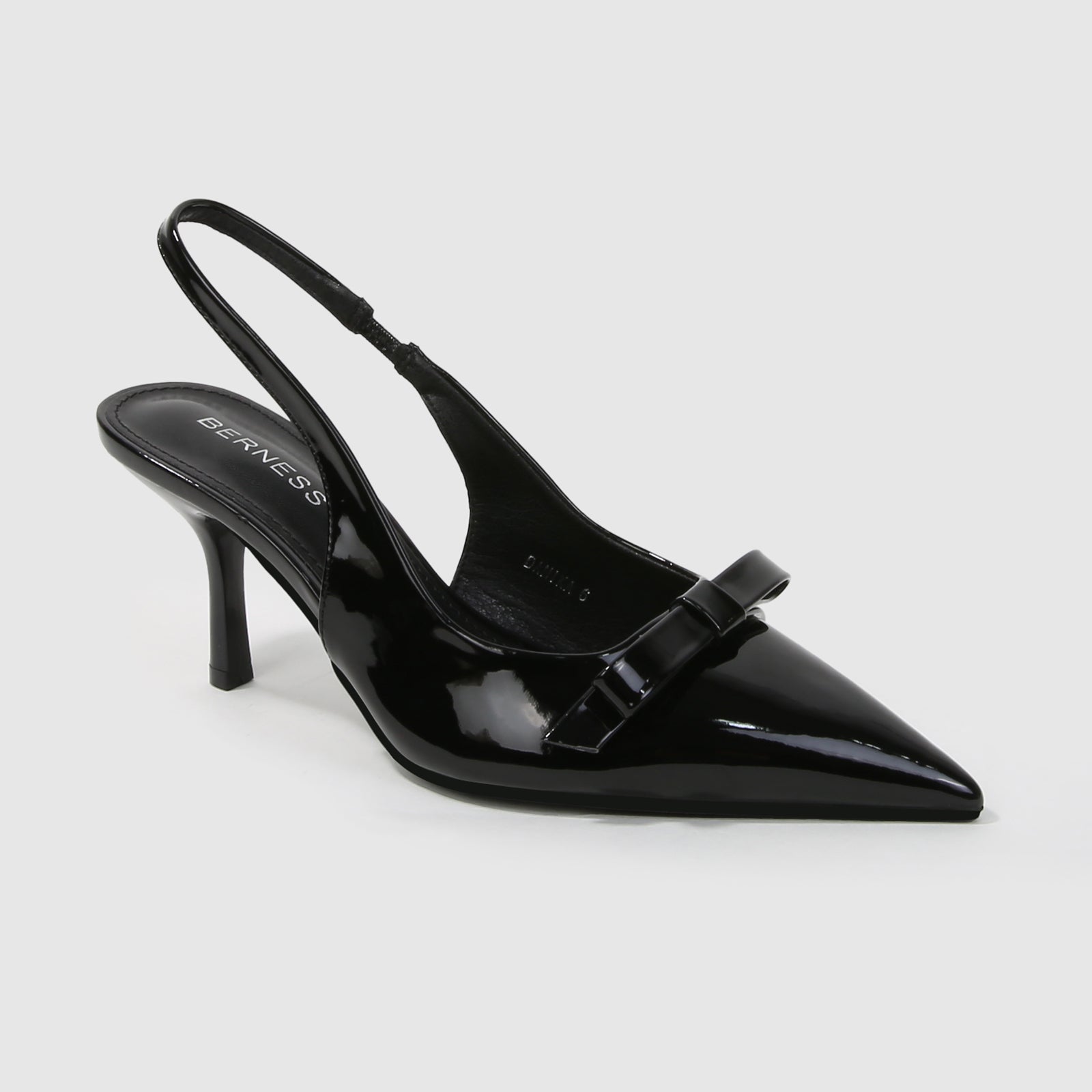 Crafted in smooth faux leather, these slingback stiletto heels feature a sleek pointed toe and a polished bow accent for a refined, feminine finish. The streamlined silhouette and elegant heel height make them a versatile choice for workdays, semi-formal occasions, and elevated evenings out.