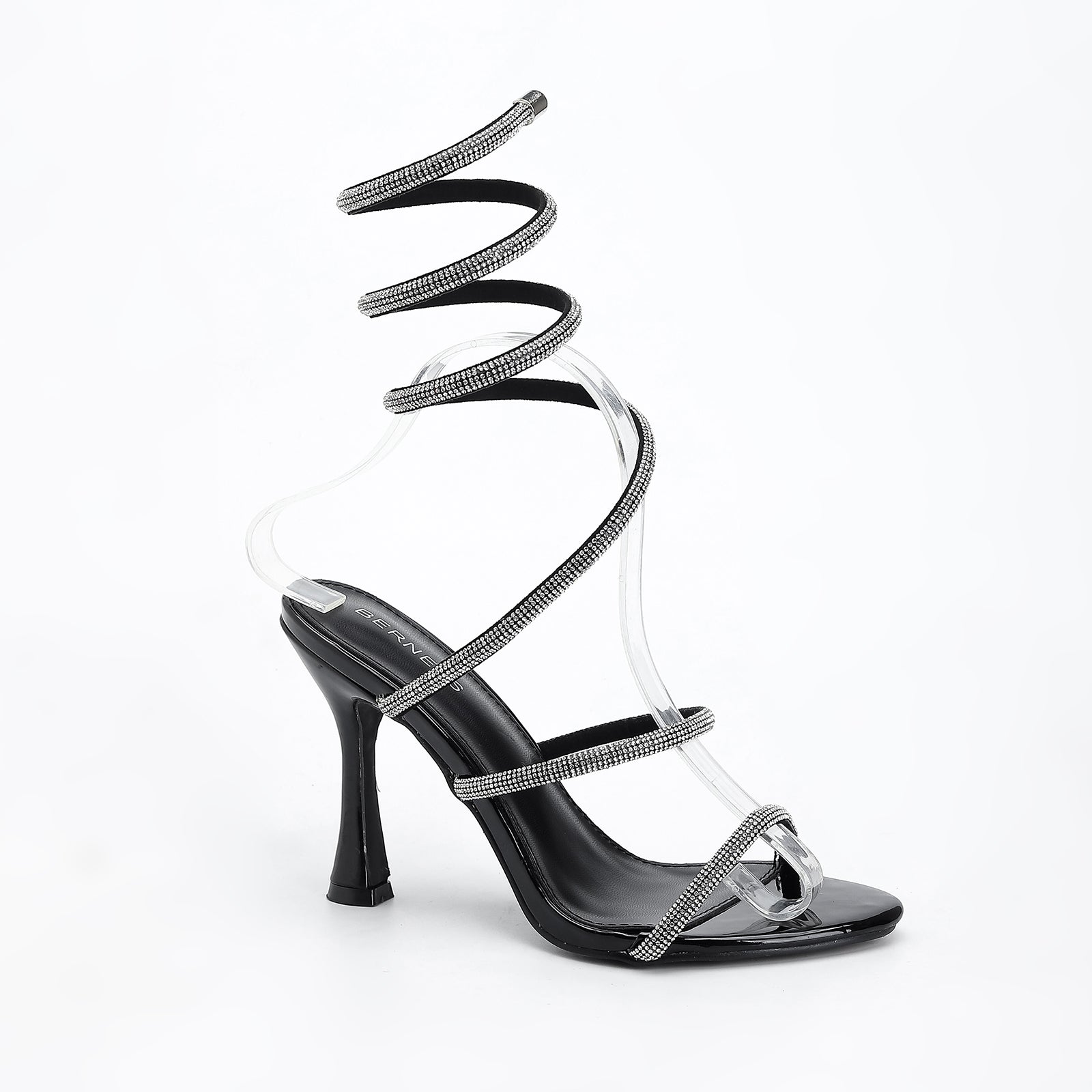 Make a bold statement with the Alexandra Heels, featuring a striking rhinestone-adorned coil strap that wraps elegantly around the ankle. Designed for both glamour and comfort, these heels add a captivating touch to evening wear, special events, or nights out.