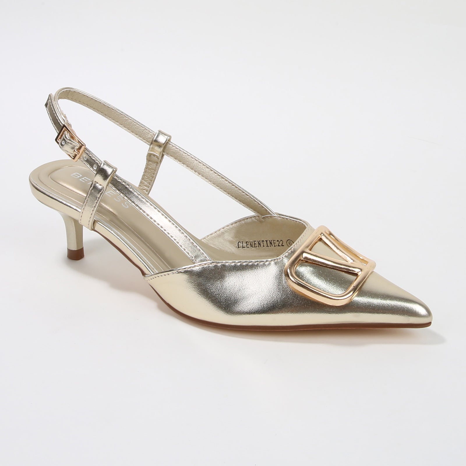 A refined take on statement elegance. The Clementine slingbacks feature a glossy finish and a sculpted oversized buckle, adding modern polish to this pointed-toe silhouette. The low kitten heel offers comfort and poise, perfect for formal events, dinner parties, or elevated daywear.