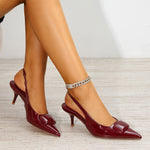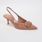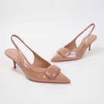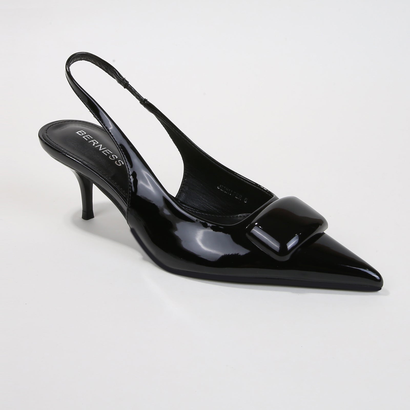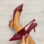 Sculptural elegance in a glossy package. These patent slingback heels showcase a striking geometric accent at the toe, balanced by a sleek pointed silhouette and kitten heel. Designed to elevate your wardrobe with modern polish, they're perfect for work, dinners, or evening affairs.