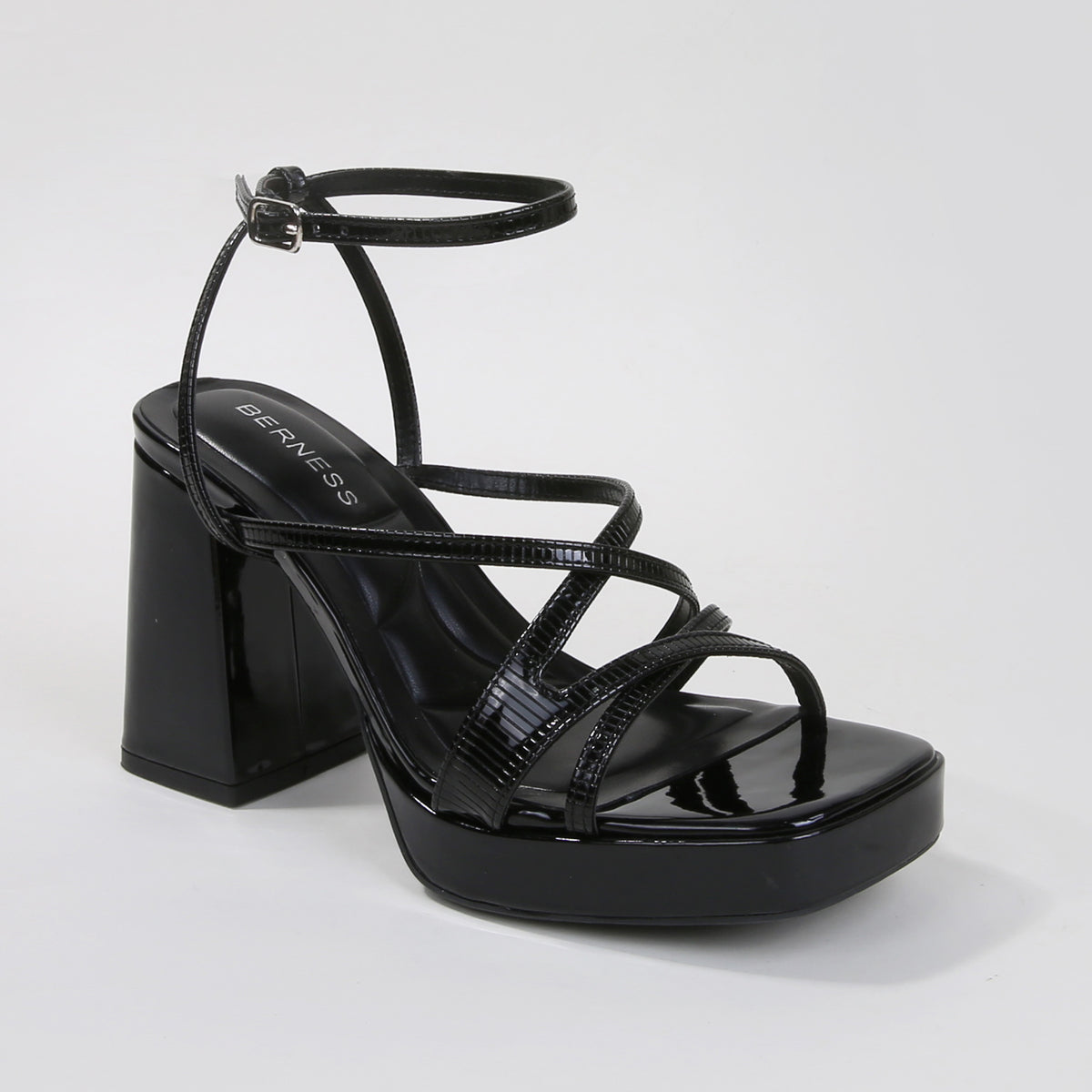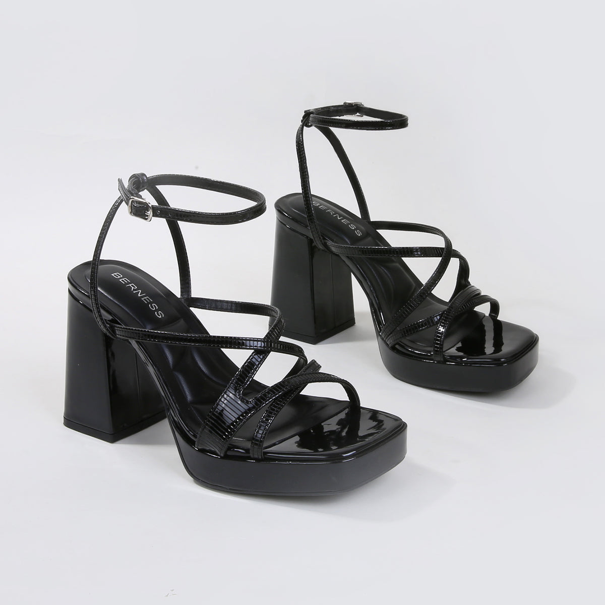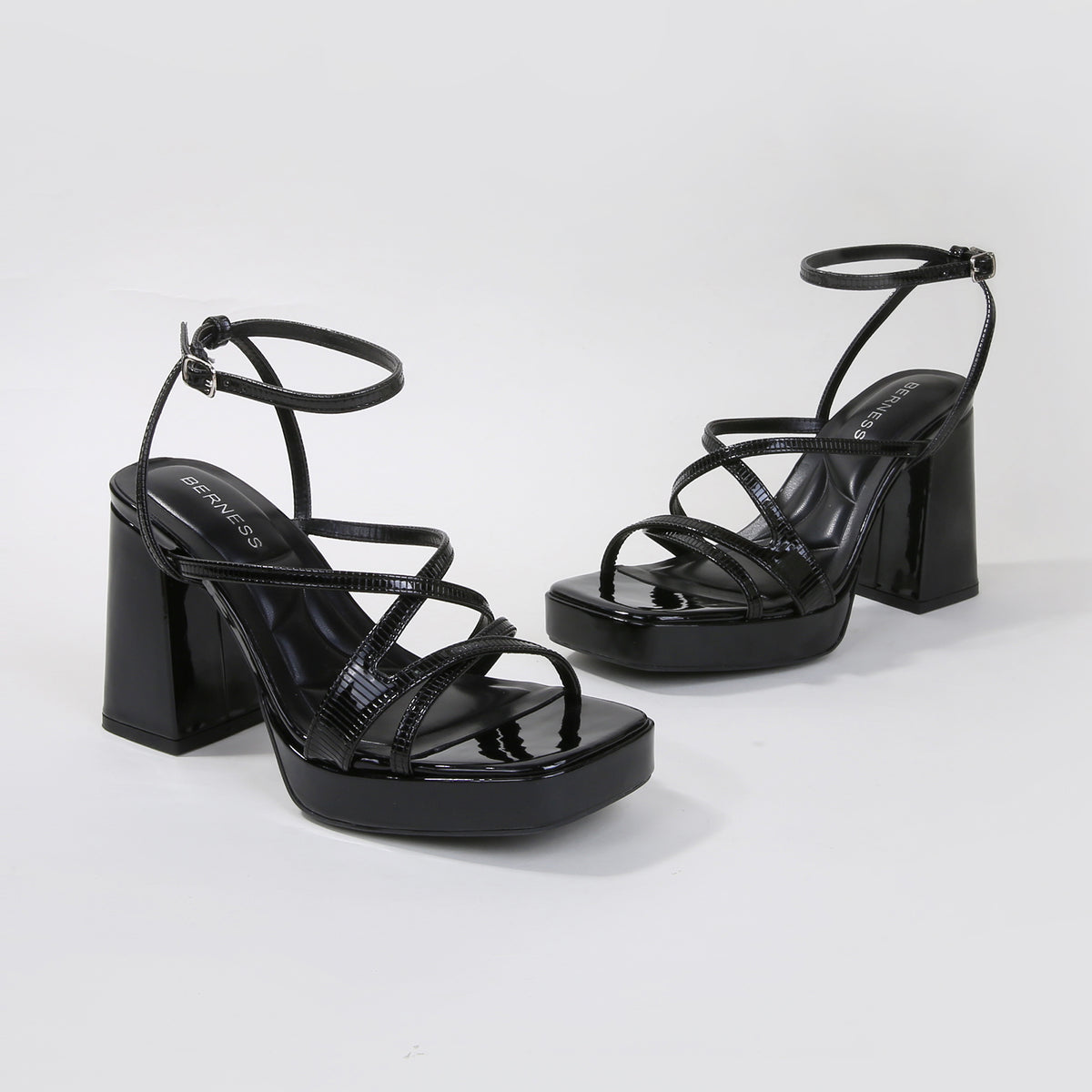 Featuring sleek, glossy crisscross straps, a modern platform sole, and a sturdy block heel, these sandals add chic sophistication and comfort to any ensemble. Perfect for a night out or special events.