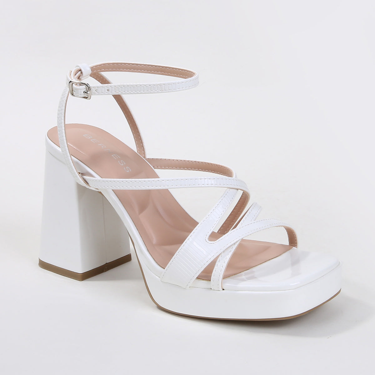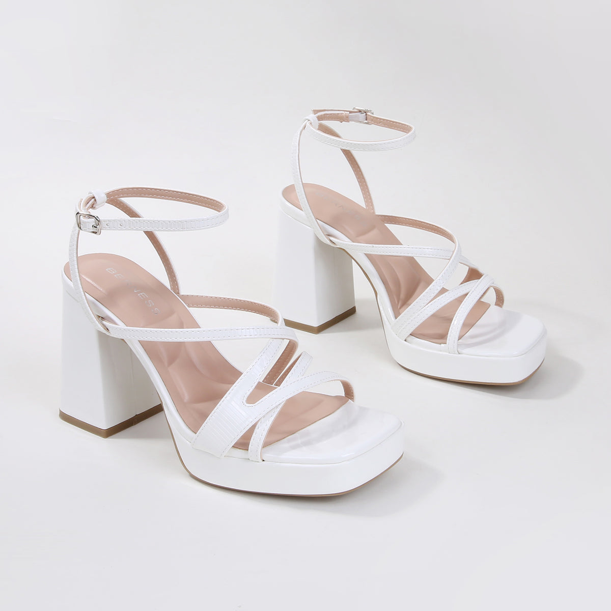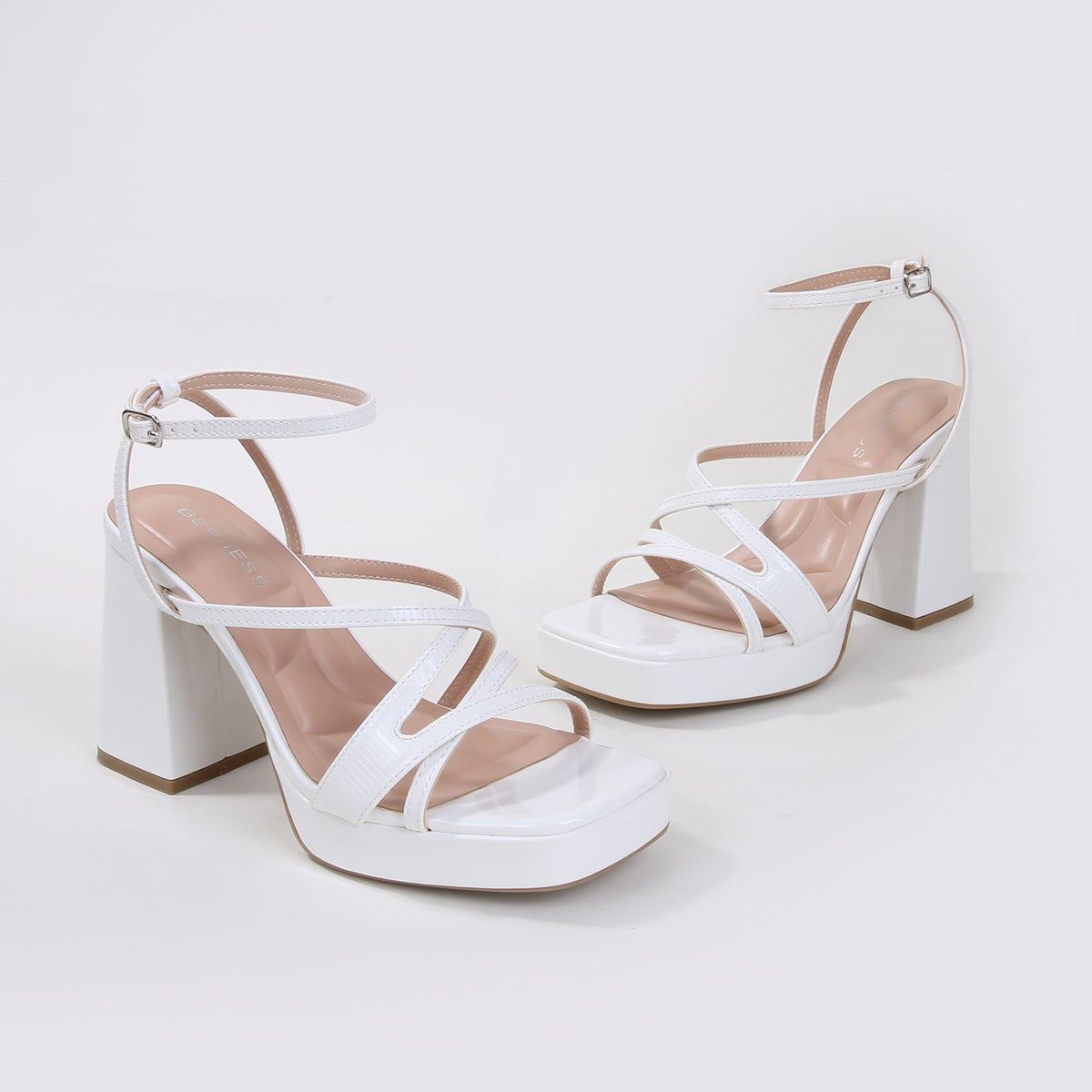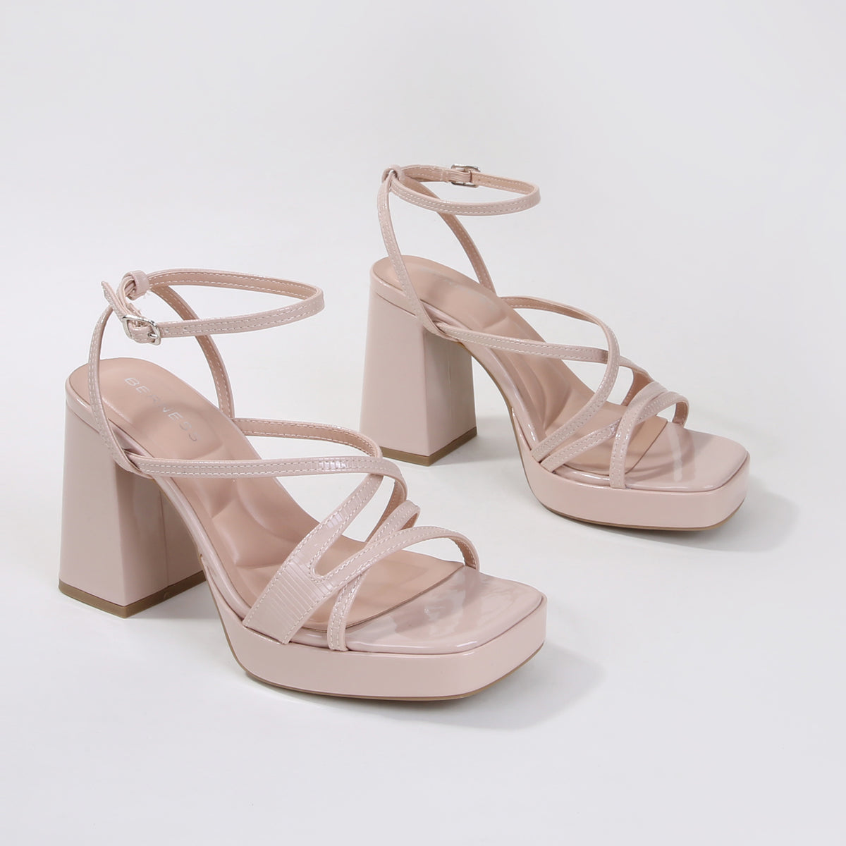 Featuring sleek, glossy crisscross straps, a modern platform sole, and a sturdy block heel, these sandals add chic sophistication and comfort to any ensemble. Perfect for a night out or special events.