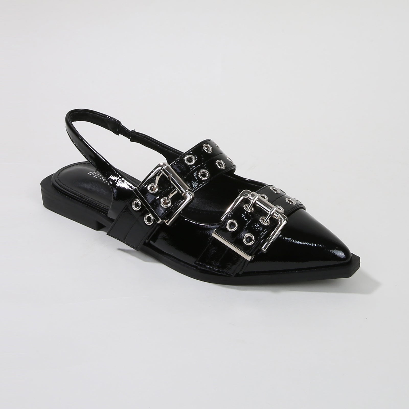 Step up your style game with these sleek slingback flats, designed to add a touch of edgy sophistication to any outfit. Featuring striking double-buckle details and a pointed toe, these flats blend modern fashion with everyday comfort. Perfect for pairing with tailored trousers, skirts, or dresses, they seamlessly transition from office wear to evening outings, offering both versatility and flair.
