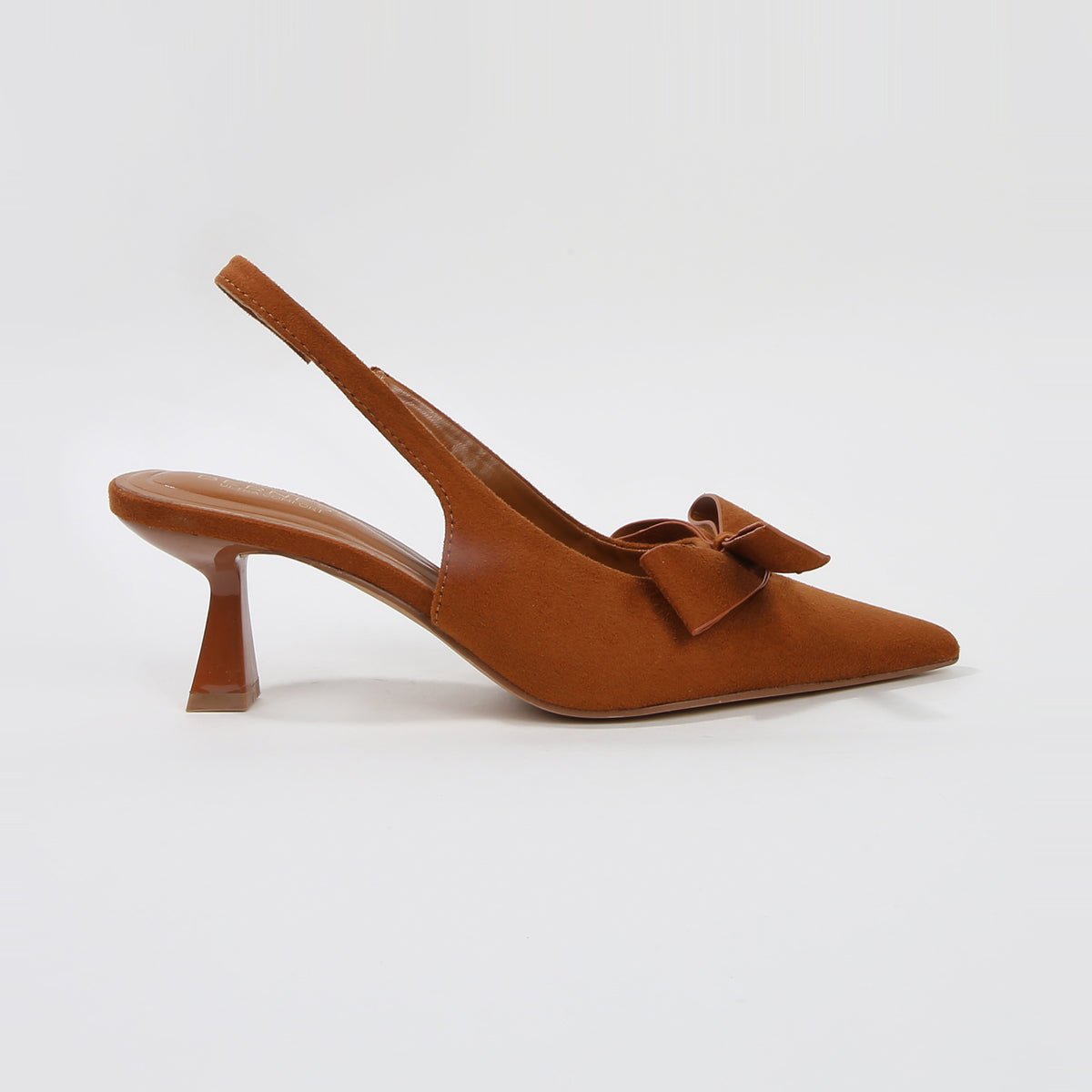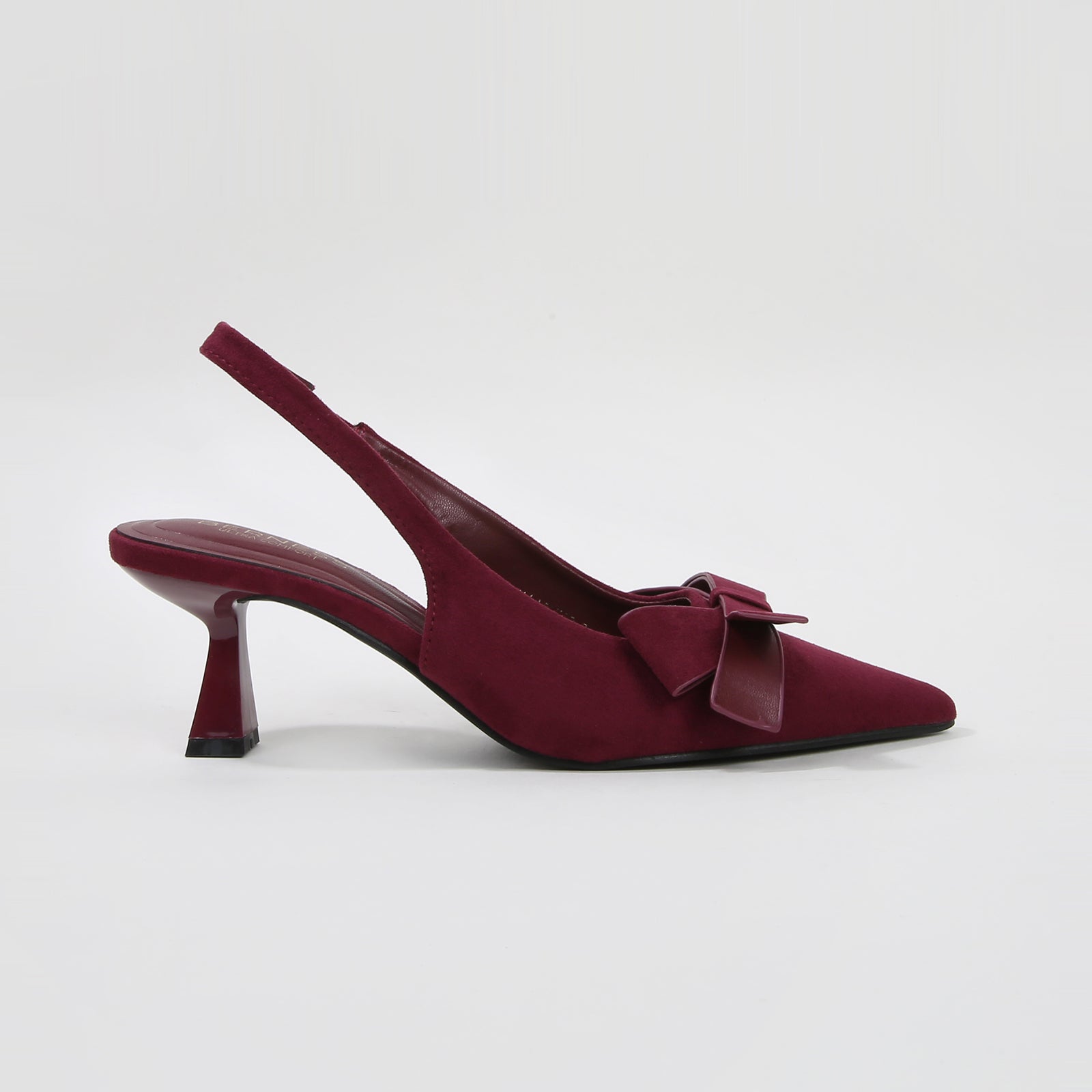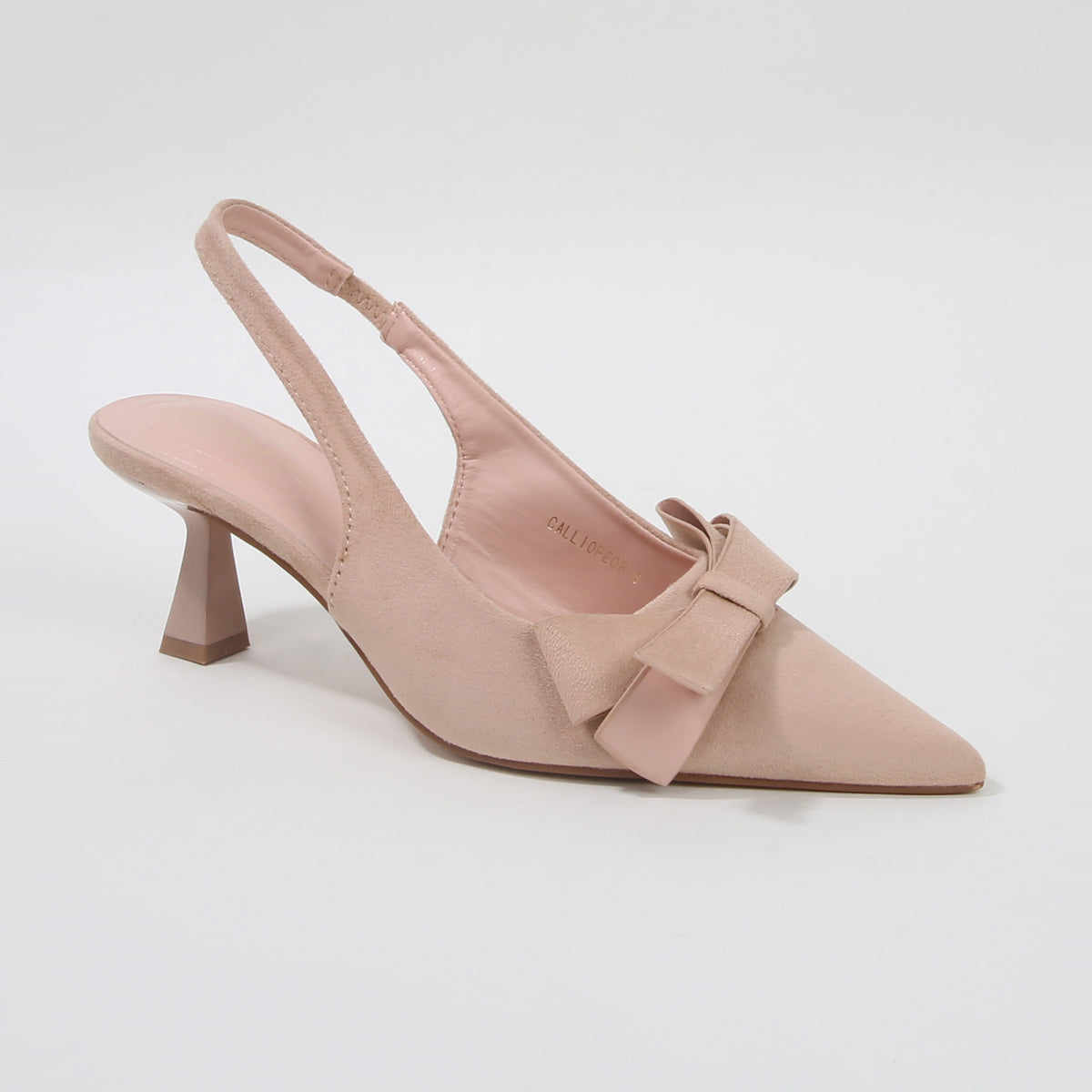 Soft, elegant, and effortlessly polished. Calliope heels features a refined faux suede upper with a delicate bow detail and a sleek pointed toe silhouette. Designed with a comfortable kitten heel and slingback strap, this style transitions seamlessly from office days to date nights, weddings, and semi-formal events where understated elegance makes the statement.