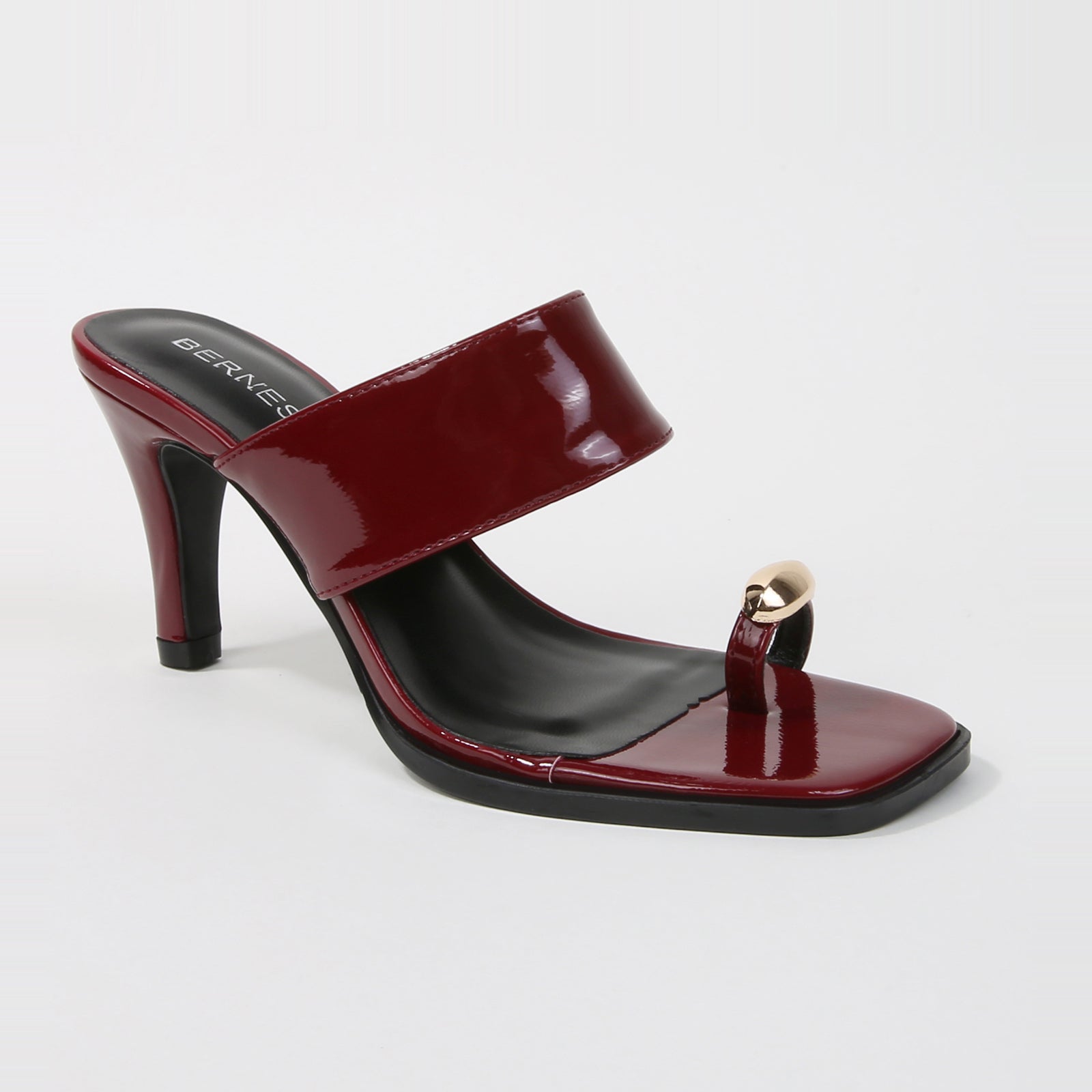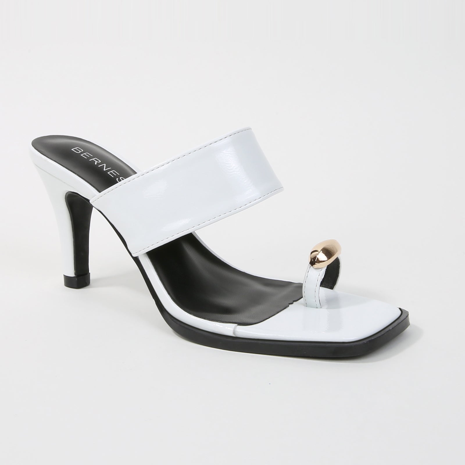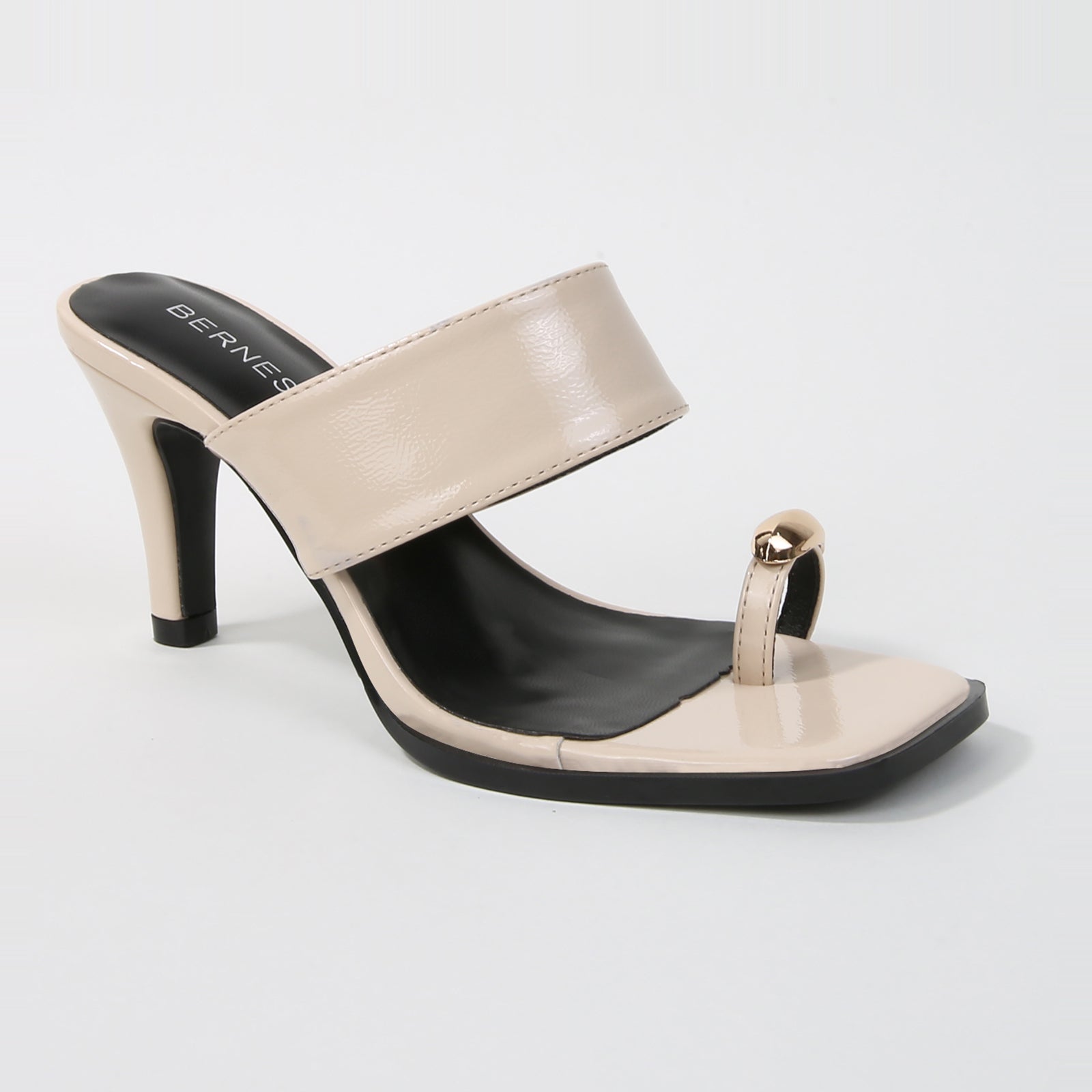 Polished and sculptural. These patent heels feature a bold wide strap and a chic metallic toe ring accent, adding a modern twist to a minimalist silhouette. Perfect for dinner dates, parties, or any moment you want sleek, effortless glamour.